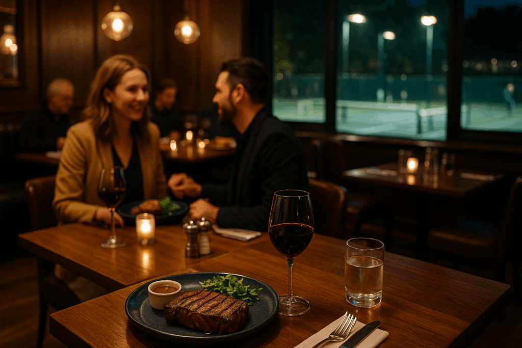 It’s the kind of place where you can talk about tie-breaks while cutting into a perfectly seared sirloin.